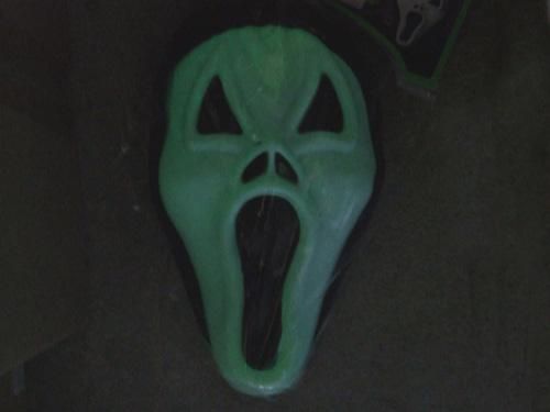 日光や通常の蛍光灯に数分間当てると、マスク部が暗闇で緑色に光ります。