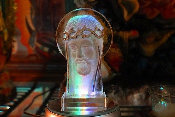 本品の色はクリアーですが、間接照明とか、下部から照明を当てたりすると幻想的に輝くキリストに変身するのです☆