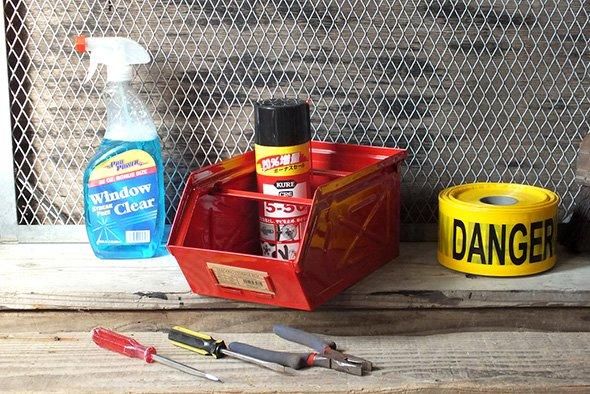 ガレージやキッチン、リビングで小物等を見せて収納するインテリア。
